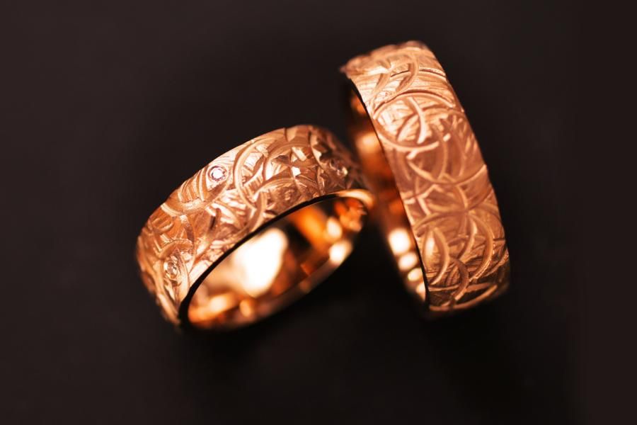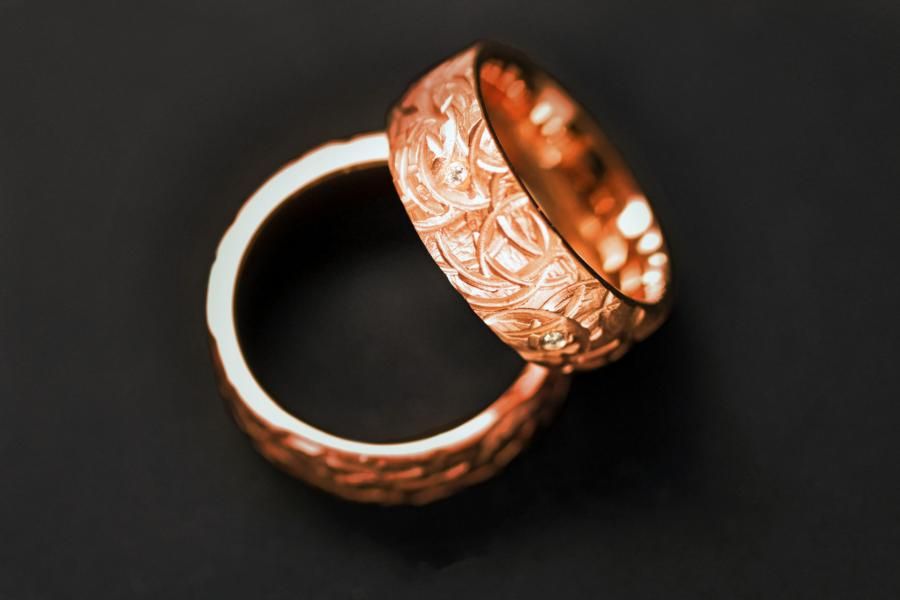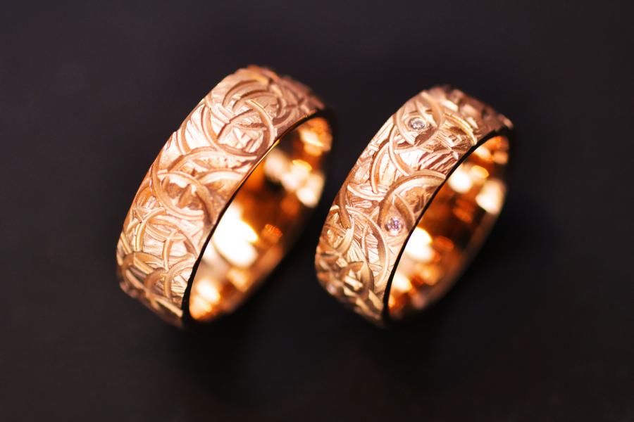 Die Trauringe Kreisel sind aus Roségold gefertigt. Die Oberfläche ist bei jedem Ring ein Unikat bei dem die Anordnung der Kreisel bei jedem Ring variiert. Die Ringform ist von einer angenehmen mittleren breite, gewölbt und somit angenehm zu tragen. Der Damenring wird zusätzlich von 6 verstreuten Diamanten geziert. Weitere Variationen dieser Trauringe sind nach Absprache möglich. Fügen Sie die Ringe auf die Merkliste und vergleichen Sie sie mit den anderen Schmuckstücken
