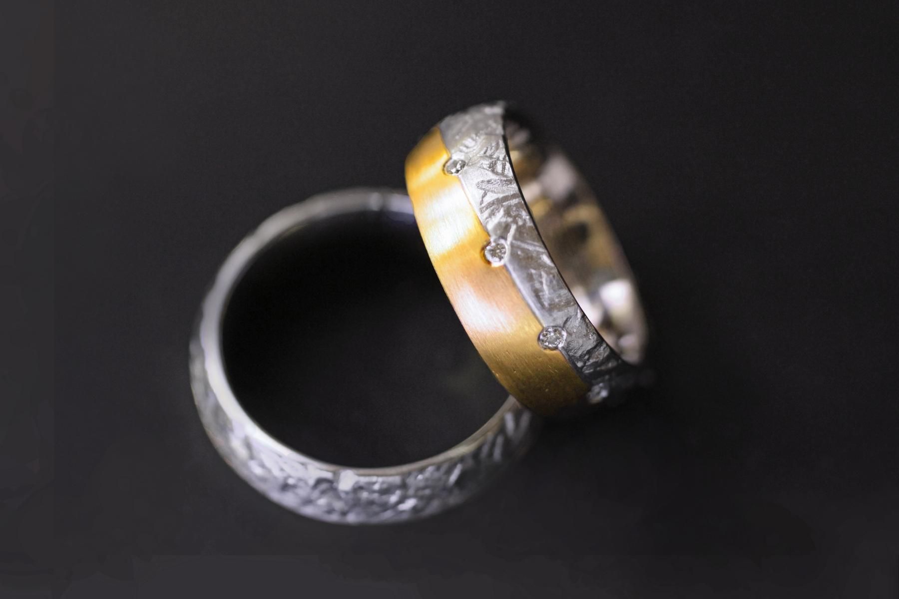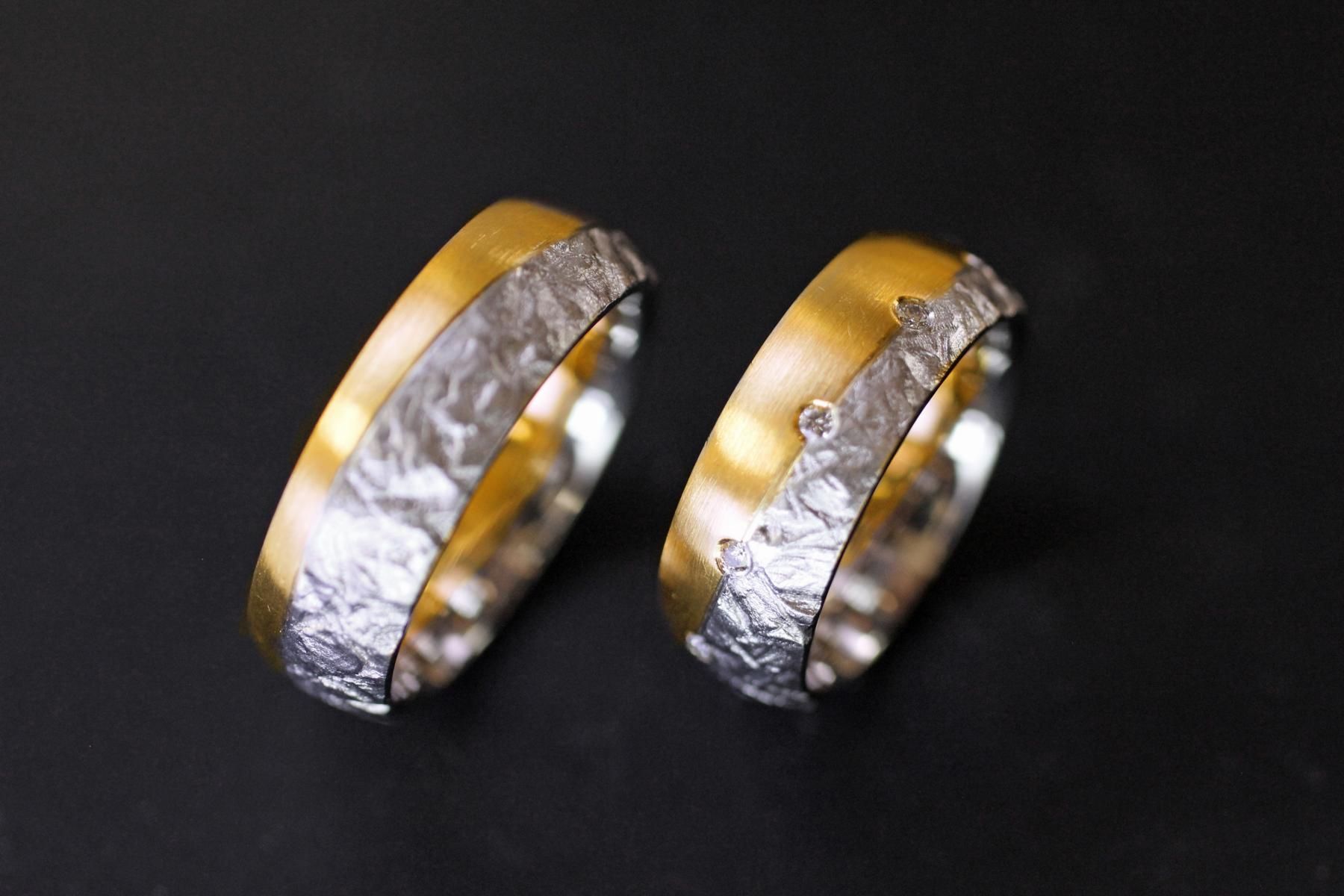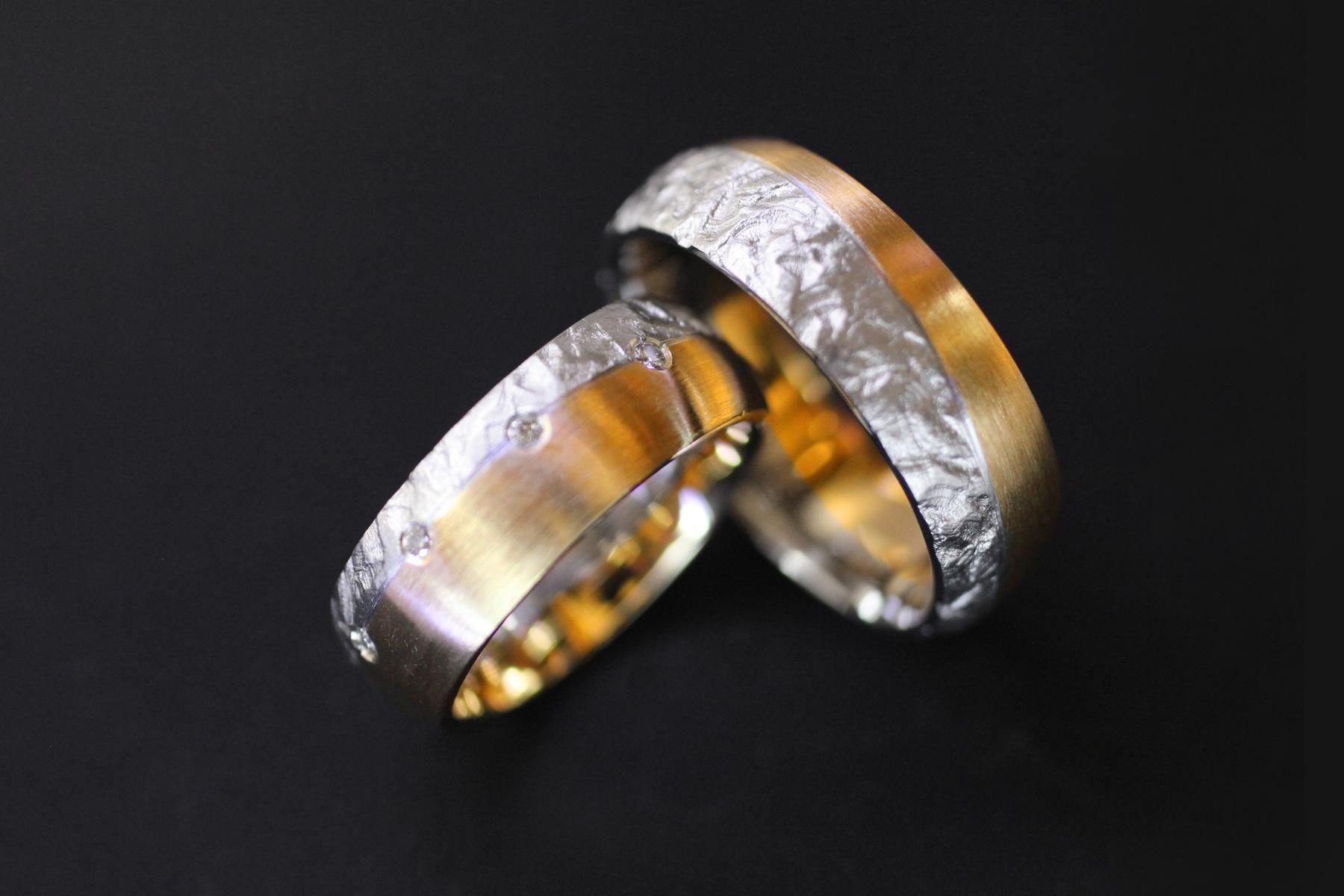 Dieses Trauringpaar ist ein perfekter Kompromiss zwischen zwei verschiedenen Goldfarben und glatter oder strukturierter Oberfläche. Die Abgebildete Version der Ringe ist in Gelbgold und Weissgold gehalten. Für ihre individuellen Ringe bieten wir ihnen diverse Farbkombinationen und spiel mit der Ringbreite an. Die Rille des Damenringes wird zusätzlich von 10 Diamanten geziert. Weitere Variationen dieser Trauringe sind nach Absprache möglich. Fügen Sie die Ringe auf die Merkliste und vergleichen Sie sie mit den anderen Schmuckstücken.