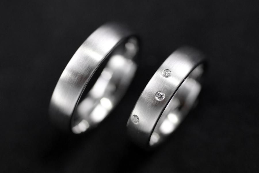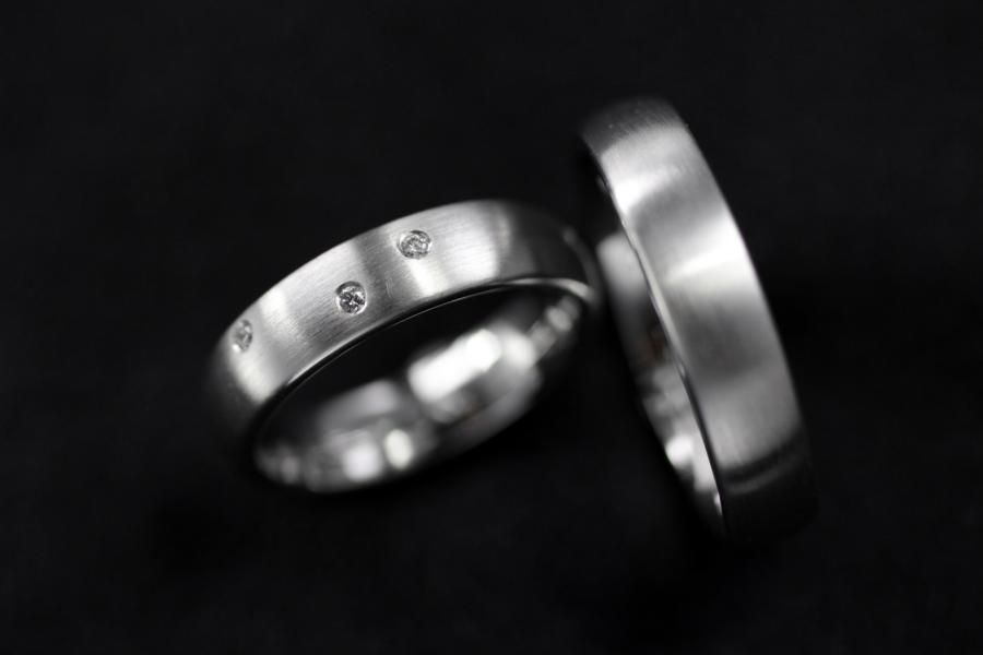 Leichte und feine Trauringe aus Weissgold. Schmaler ovaler Grundkörper mit sehr hohem Tragekomfort. Innen poliert, oben längsmattiert. Der Damenring ist bei unserem Modell zusätzlich mit 3 Diamanten geschmückt. Weitere Variationen dieser Trauringe sind nach Absprache möglich. Fügen Sie die Ringe auf die Merkliste und vergleichen Sie sie mit den anderen Schmuckstücken.