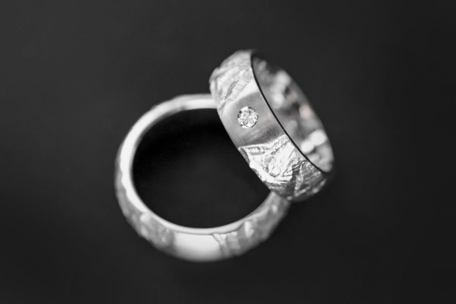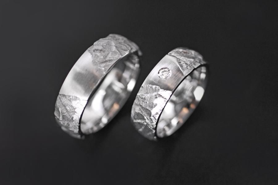Diese Trauringe sind ein perfekter Kompromiss zwischen glatter und strukturierter Oberfläche. Die Struktur ist tief geschnitzt und mattiert. Die Abgebildete Version der Ringe ist von einer mittleren breite mit einem bequemen gewölbten Ringkörper. Eingefasst in der Mitte des Damenringes ist 1 funkelnder Diamant. Weitere Variationen dieser Trauringe sind nach Absprache möglich. Fügen Sie die Ringe auf die Merkliste und vergleichen Sie sie mit den anderen Schmuckstücken.