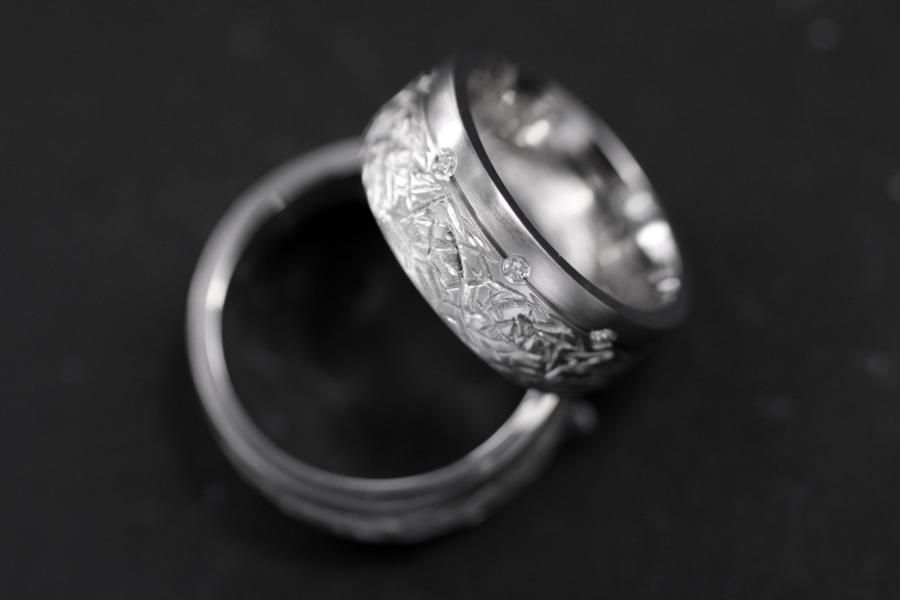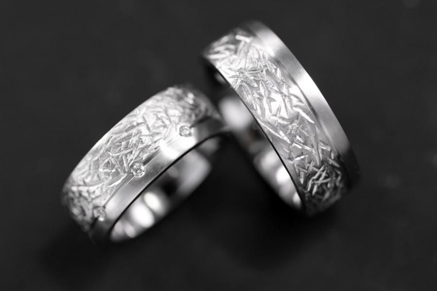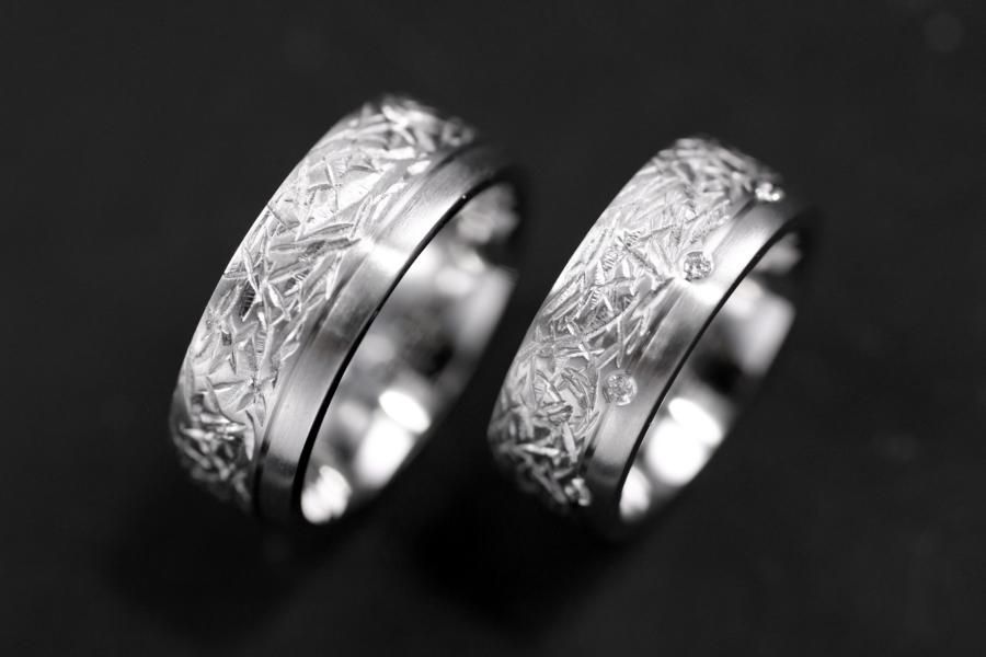 Diese Trauringe aus Weissgold mit leicht gewölbter Oberfläche sind aufgeteilt in Struktur und längsmatter Fläche. Jede Struktur wir individuell von Hand gefräst. Im Damenring befinden sich zusätzlich, zwischen dem flachen Streifen und der Struktur, kleine glitzernde Brillanten. Zeitlos und dennoch lebendige Ringe die Massiv gearbeitet sind. Weitere Variationen dieser Trauringe sind nach Absprache möglich.Fügen Sie die Ringe auf die Merkliste und vergleichen Sie sie mit den anderen Schmuckstücken.