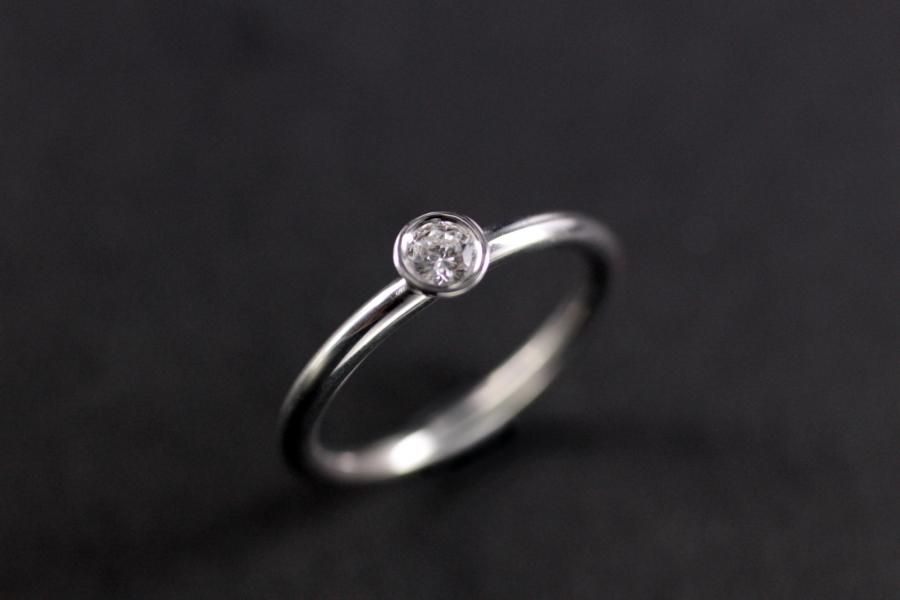 Dieser Verlobungsring ist leicht und schlicht gearbeitet. Das Weissgold überlässt dem Diamanten seinen glitzernden Auftritt. Die geschlossene Fassung schwebt auf der runden bequemen Ringschiene und erlaubt es den Ring auch als beisteck Solitaire zu verwenden. Dieser Ring bieten wir mit verschiedenen Steingrössen an: Das abgebildete Modell ist auf der Übersicht der dritte von Links und trägt einen 0,15 ct. Diamant im Brillantschliff. Fügen Sie die Ringe auf die Merkliste und wir werden ihnen eine Offerte zukommen lassen.