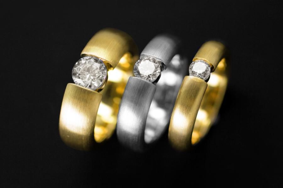 Dieser gelbgoldene Verlobungsring ist ein sehr schwer und massiv. Die Ringschiene ist oval, gleichlaufend unten ist sie schlanker, dies verspricht einen angenehmen Tragekomfort. Besonders robust wird dieser Ring dank einer feinen geschlossenen Fassung die sich hinter dem Stein versteckt und so den Eindruck hinterlässt der Stein wäre eingeklemmt. Dieser Ring bieten wir in verschiedenen Dimensionen an: Das abgebildete Modell ist auf dem Gruppenbild das rechts und trägt einen 1,0ct. Diamant im Brillantschliff. Wir offerieren ihnen aber auch gerne andere Materialien und Grössen. Fügen Sie die Ringe auf die Merkliste und wir werden ihnen eine Offerte zukommen lassen.