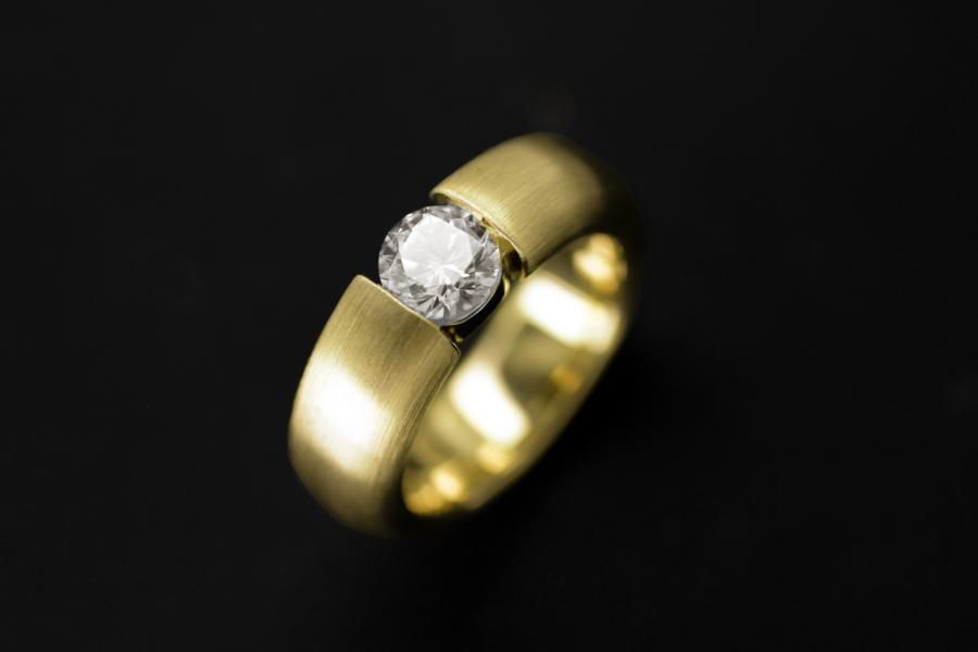 Dieser gelbgoldene Verlobungsring ist ein sehr schwer und massiv. Die Ringschiene ist oval, gleichlaufend unten ist sie schlanker, dies verspricht einen angenehmen Tragekomfort. Besonders robust wird dieser Ring dank einer feinen geschlossenen Fassung die sich hinter dem Stein versteckt und so den Eindruck hinterlässt der Stein wäre eingeklemmt. Wir offerieren ihnen aber auch gerne andere Materialien. Dieser Ring bieten wir in verschiedenen Dimensionen an: Das abgebildete Modell ist auf dem Gruppenbild das links und trägt einen 1,0ct. Diamant im Brillantschliff. Fügen Sie die Ringe auf die Merkliste und wir werden ihnen eine Offerte zukommen lassen.