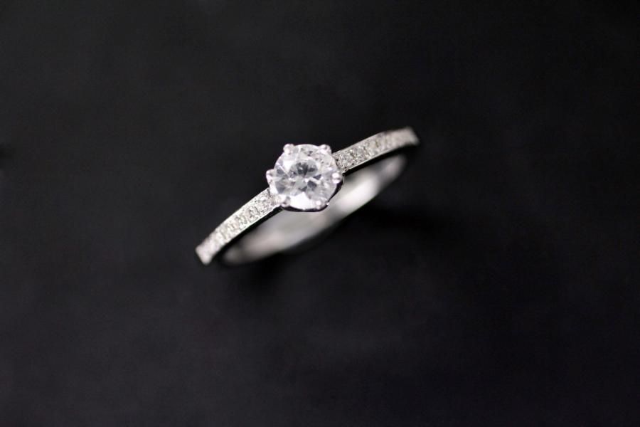 Dieser weissgoldene Verlobungsring ist verspielt und extravagant. Seine gerade Ringschiene ist zusätzlich mit einem Diamantpavé verziert und hält die Kronenfassung mit dem Brillant sicher umschlossen. Dieses elegante Modell ist einer Prinzessin würdig. Wir bieten diesen Ring mit verschiedenen Steingrössen an: Das abgebildete Modell ist auf dem Gruppenbild in der Mitte und trägt einen 0,50ct. Diamant im Brillantschliff so wie 15 Brillanten mit 0,11ct. auf der Schiene. Fügen Sie die Ringe auf die Merkliste und wir werden ihnen eine Offerte zukommen lassen.