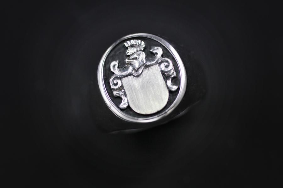 Dieser Wappenring in Weissgold ist 18,3 mm breit und gehört damit zu den grossen und massiven unserer Kollektion. Seine Grundform ist oval und Helm und Zier sind vorgearbeitet. Ihr individuelles Wappen, Symbol oder Monogramm könnte oben im Schild von Hand oder mit Laser Graviert werden. Kommen sie vorbei und lassen sie sich zu den unzähligen Möglichkeiten Beraten. Oder fügen sie die Ringe auf die Merkliste und erhalten eine Preisvorstellung.