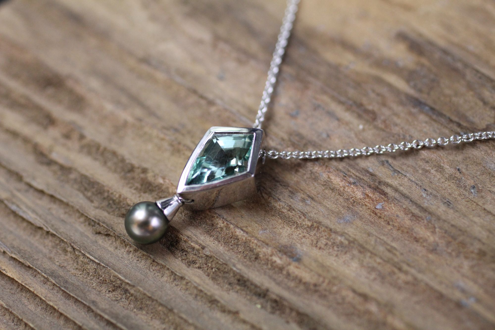 Weissgold Anhänger mit blau/grünem Beryll und Tahitiperle.