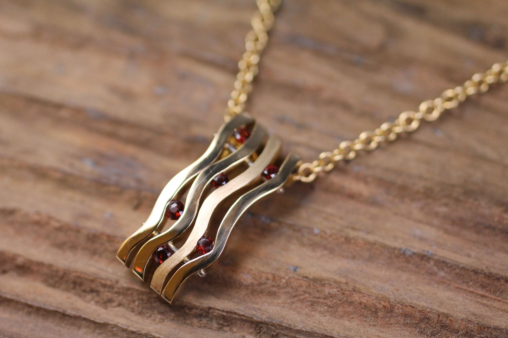 Gelbgold Anhänger AXIS-Kollektion mit 6 kleinen Granat Edelsteinen. Kundenauftrag