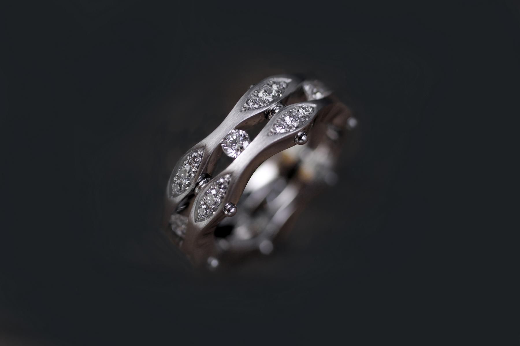 Dieser Axis-Ring besteht aus 2 Teilen, die reich mit Diamanten besetzt sind. Auf den Schienen und dazwischen.