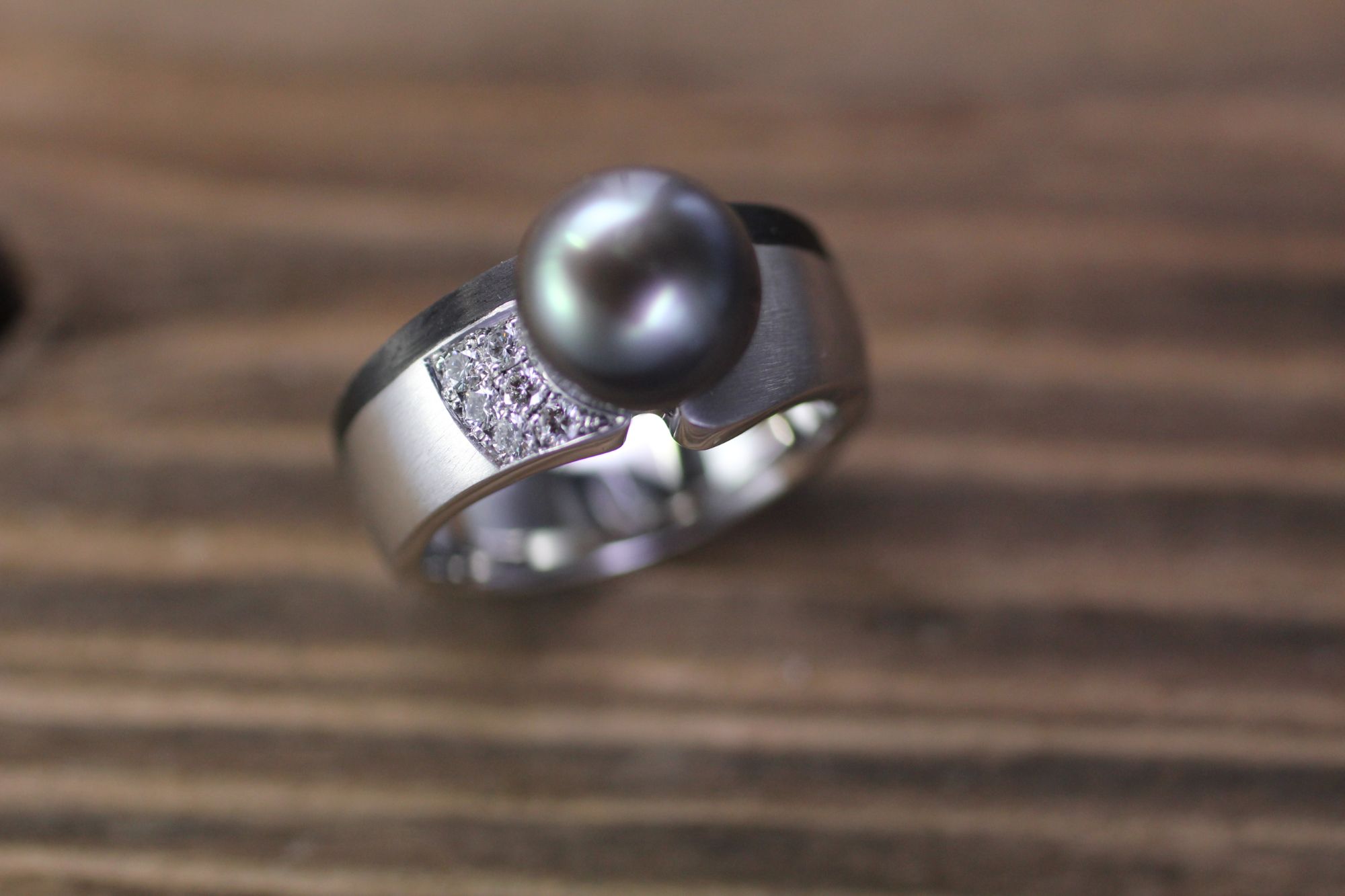 Damenring in Weissgold mit Carbon und Tahitiperle. Kundenauftrag