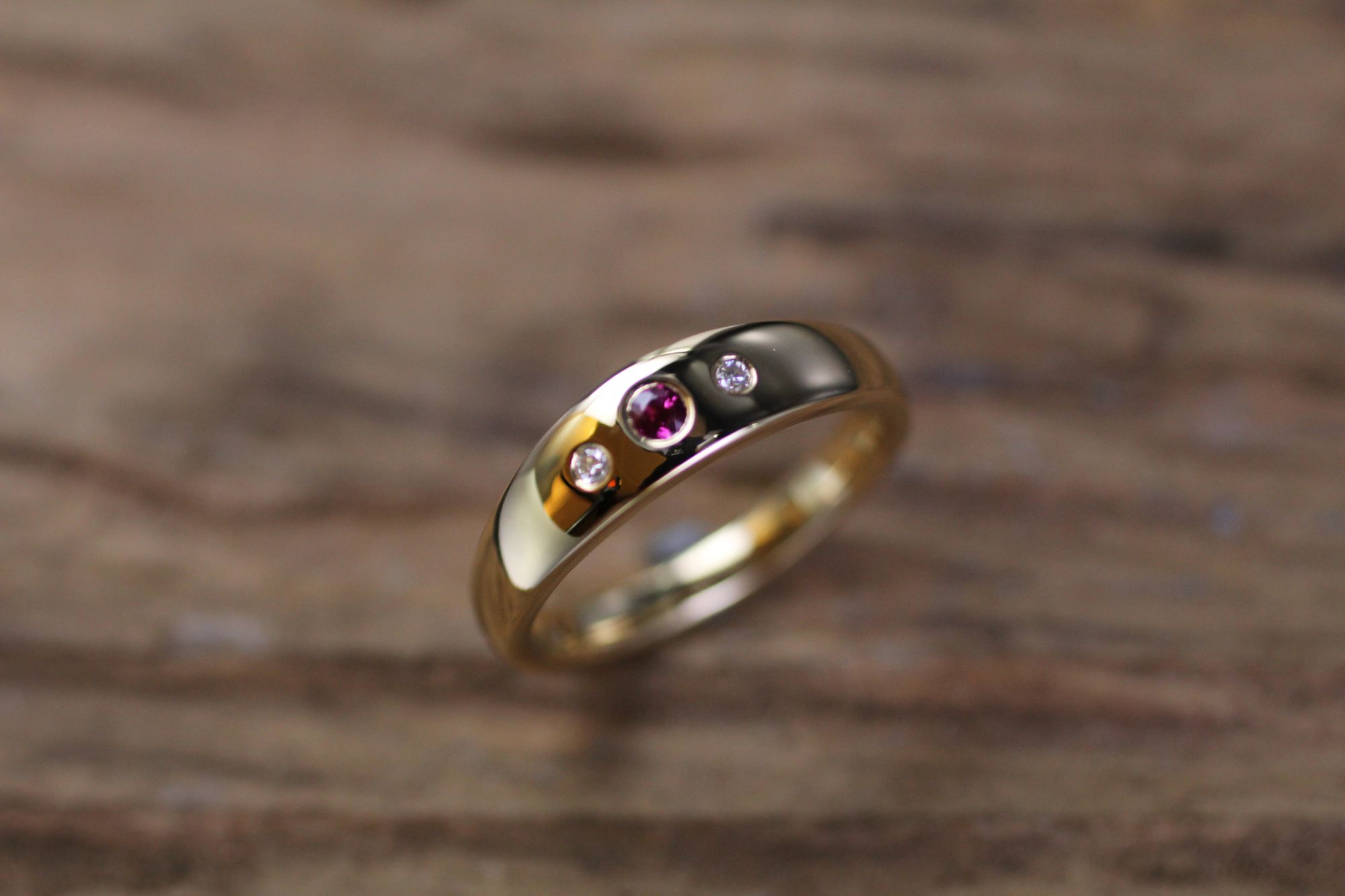 Damenring in Gelbgold mit 3 Edelsteinen, Coctalform. Kundenauftrag