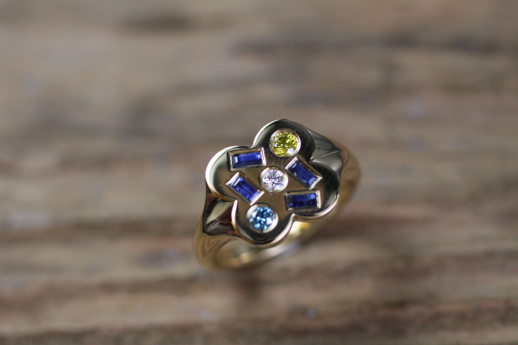 Gelbgold Damenring mit Kunden-Edelsteinen, Kleeblatt. Kundenauftrag