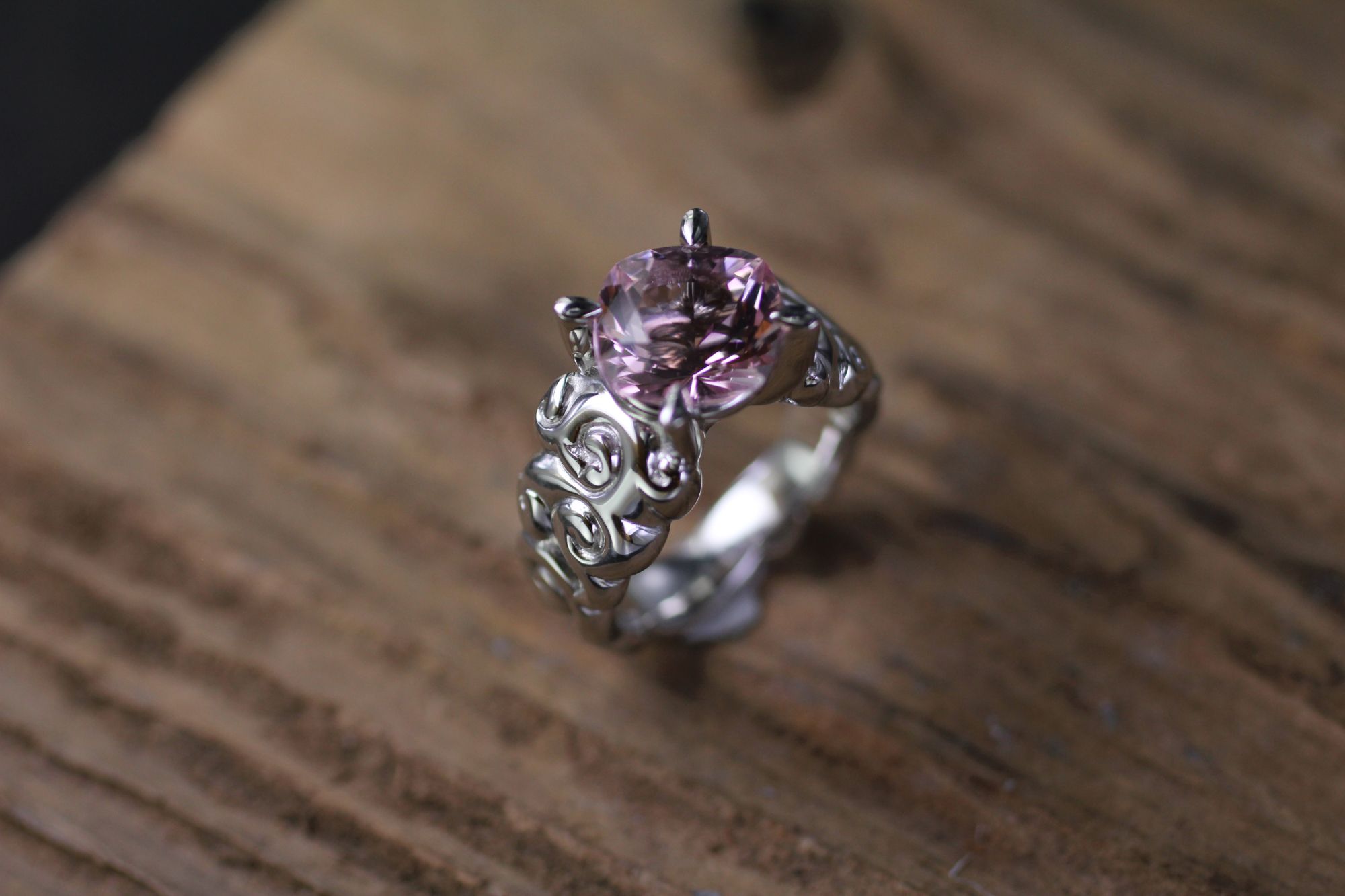 Damenring Weissgold Ornament mit violetem Edelstein.