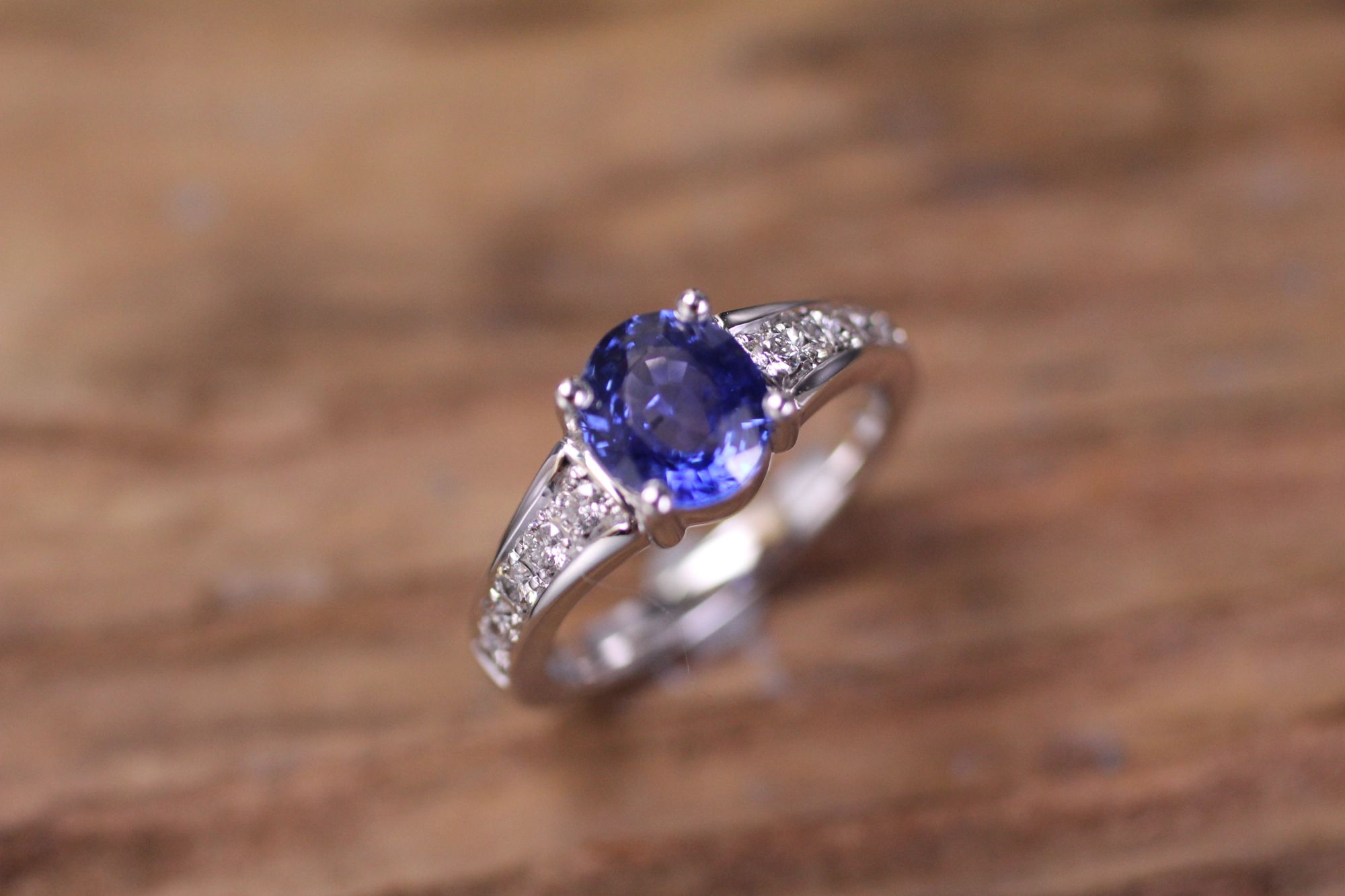 Weissgold Damenring mit grossem Saphir und Brillanten. Kundenauftrag
