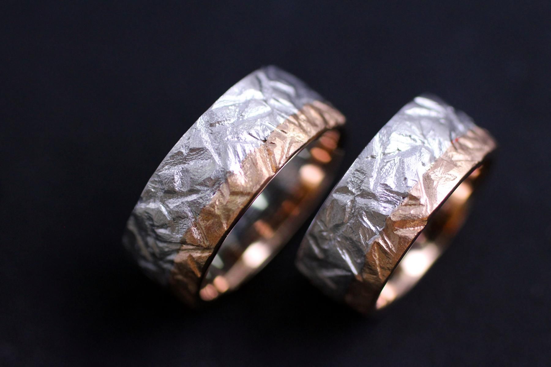 Eheringe in Rotgold und Weissgold, geschnitzt mit Eispickel Muster. Nach Kundenwunsch hergestellt
