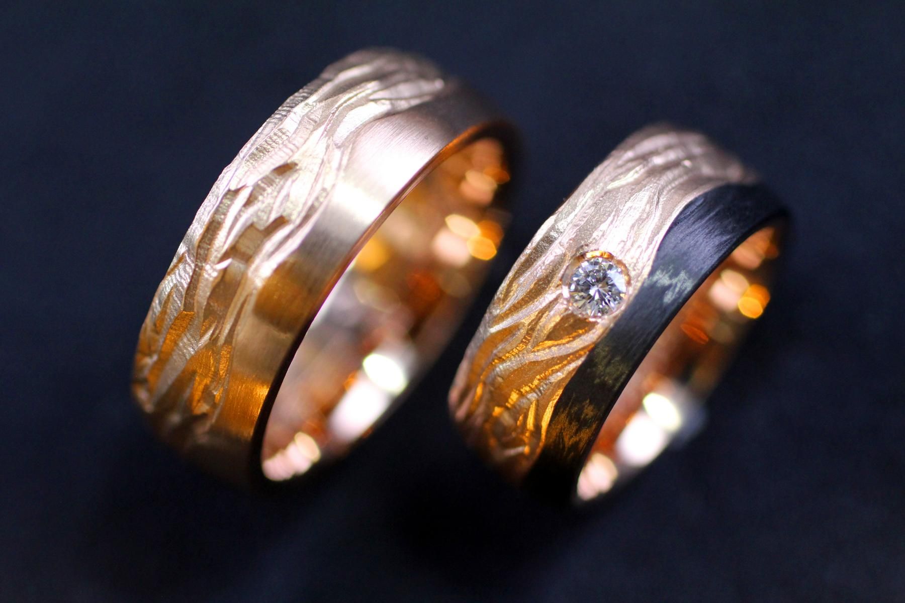 Eheringe in Rotgold und mit Carbon. Mit Gletscher Struktur und Fläche. Nach Kundenwunsch hergestellt.
