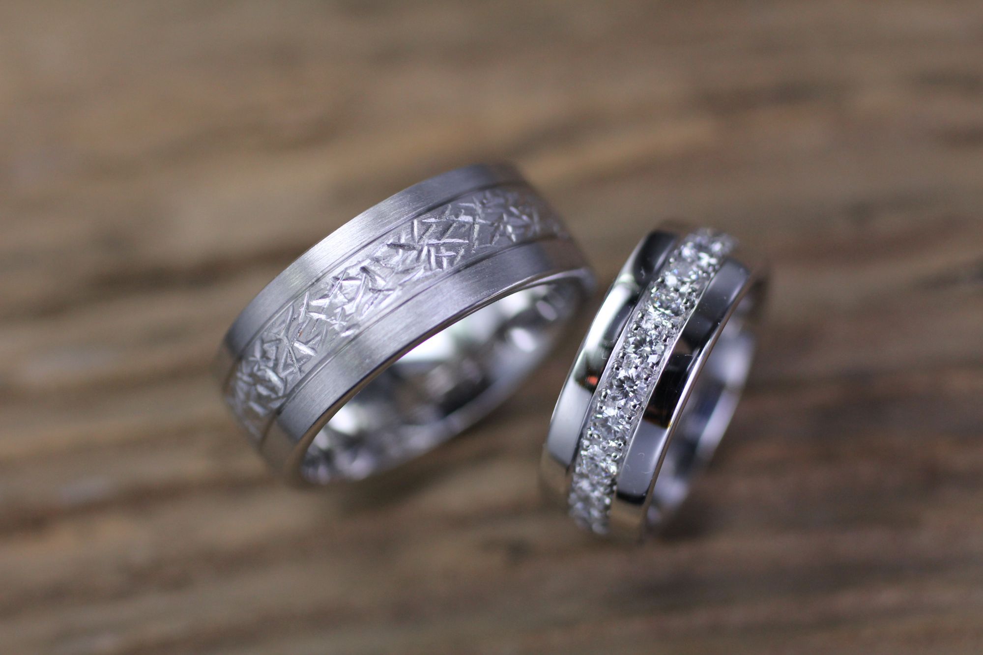 Trauringe in Weissgold, gefräst und Brillant Alliance pavé. Kundenauftrag