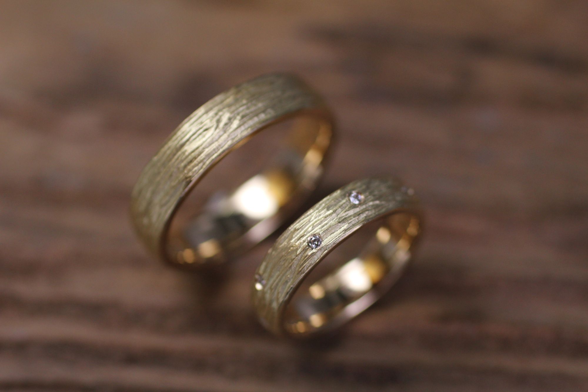 Trauringe in Gelbgold, Vogelnest Muster mit kleinen Brillanten.