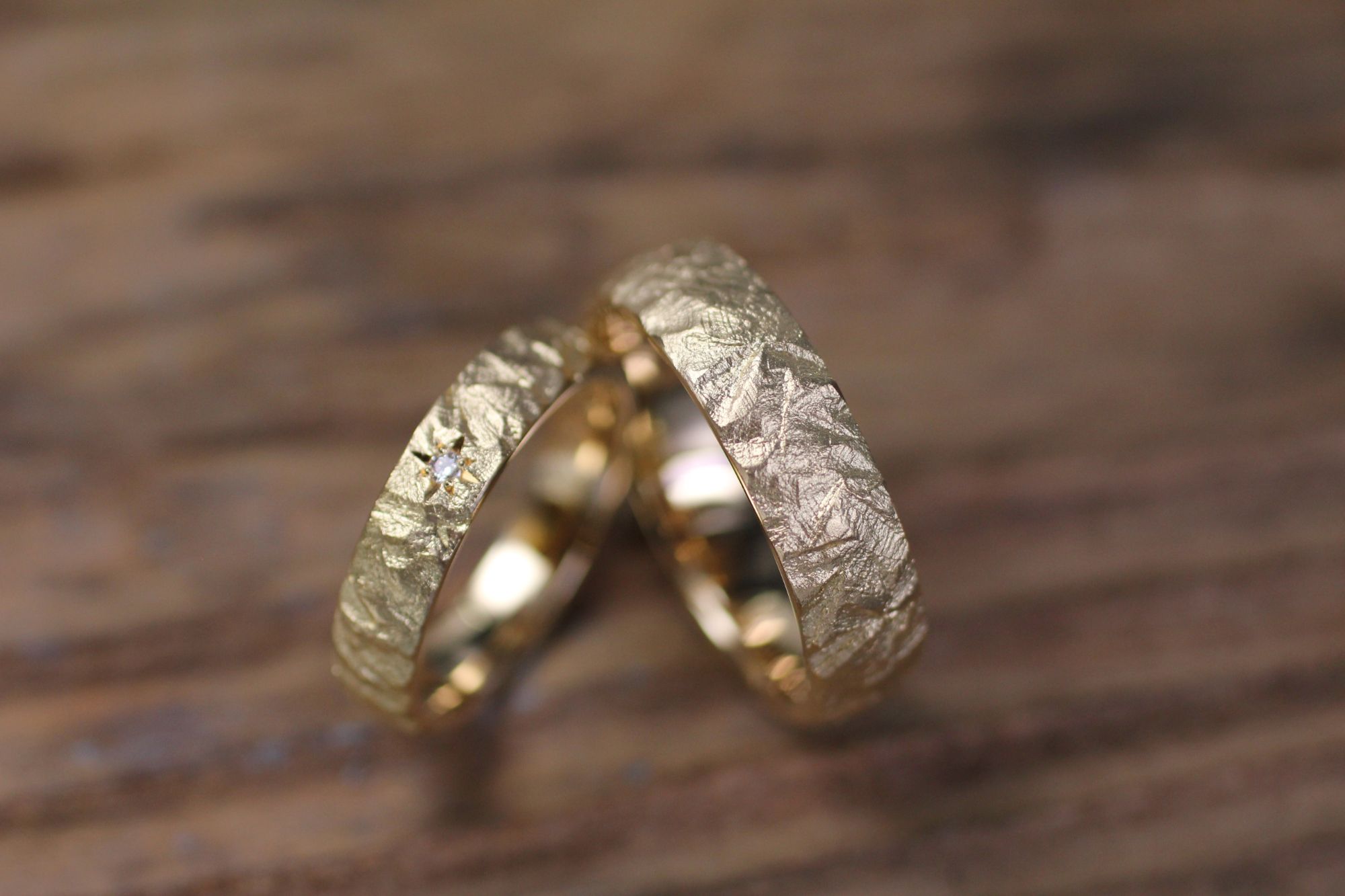Trauringe Gelbgold und Roségold mit Stern-Brillant.