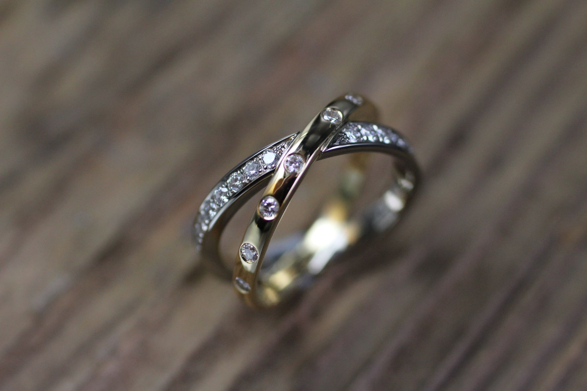 Damenring X-Form bicolor Gelb/Weissgold mit Brillanten. Kundenauftrag