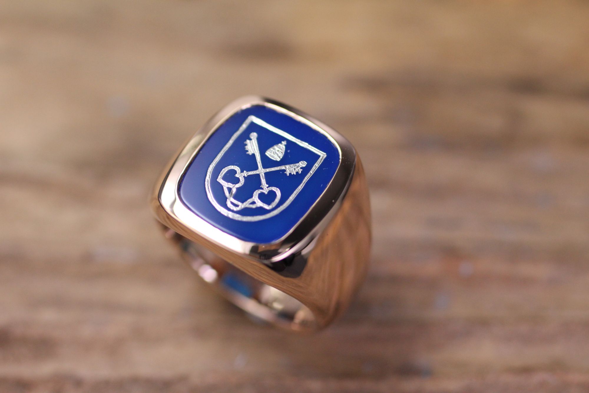 Herren Wappenring mit blauem Achat und eingelgtem Silberwappen. Kundenauftrag