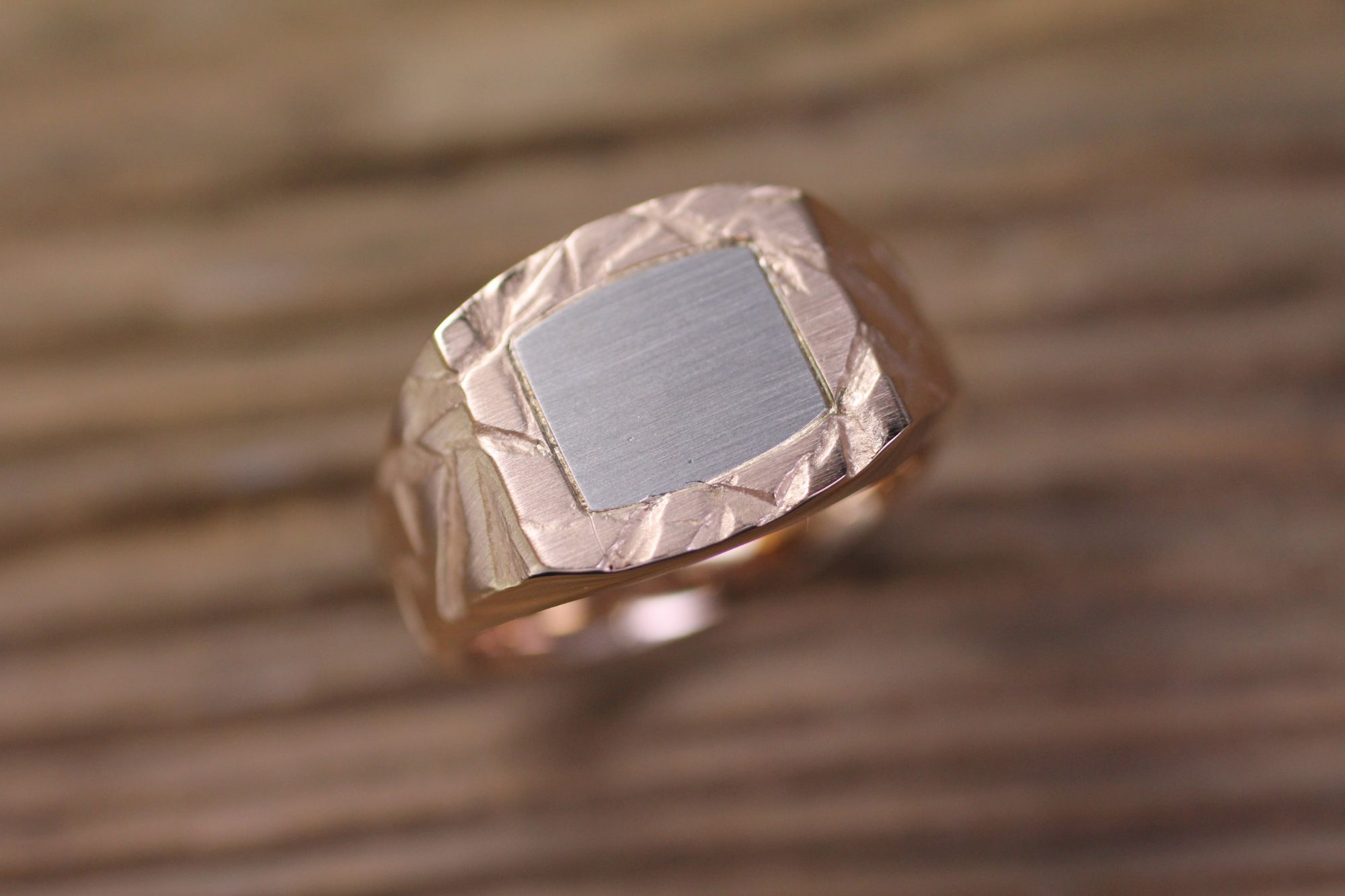 Herrenring Strukturiert in Rot-Weissgold mit Gravurplatte.