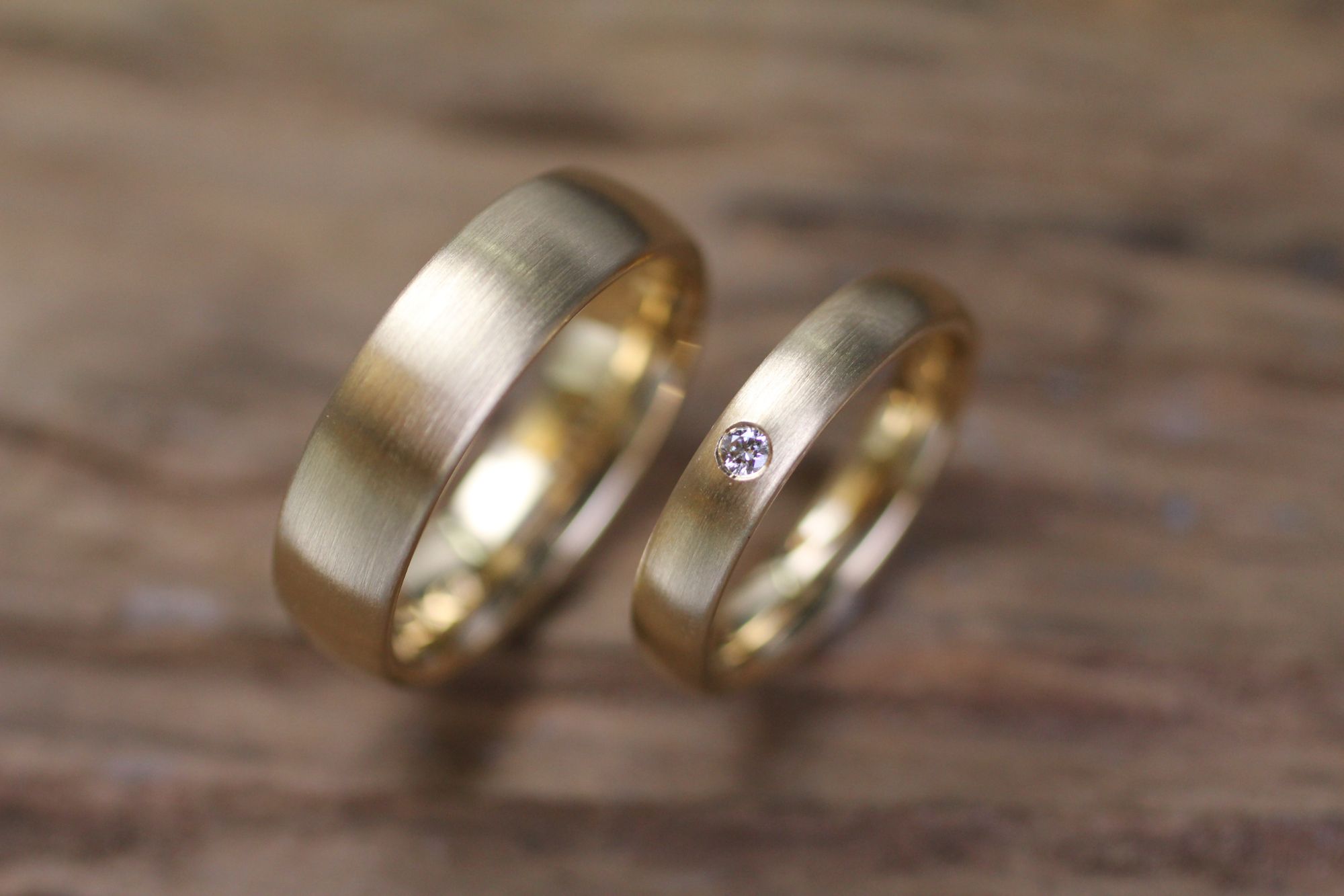 Eheringe Gelbgold matt, ovale Form, runder Brillant.