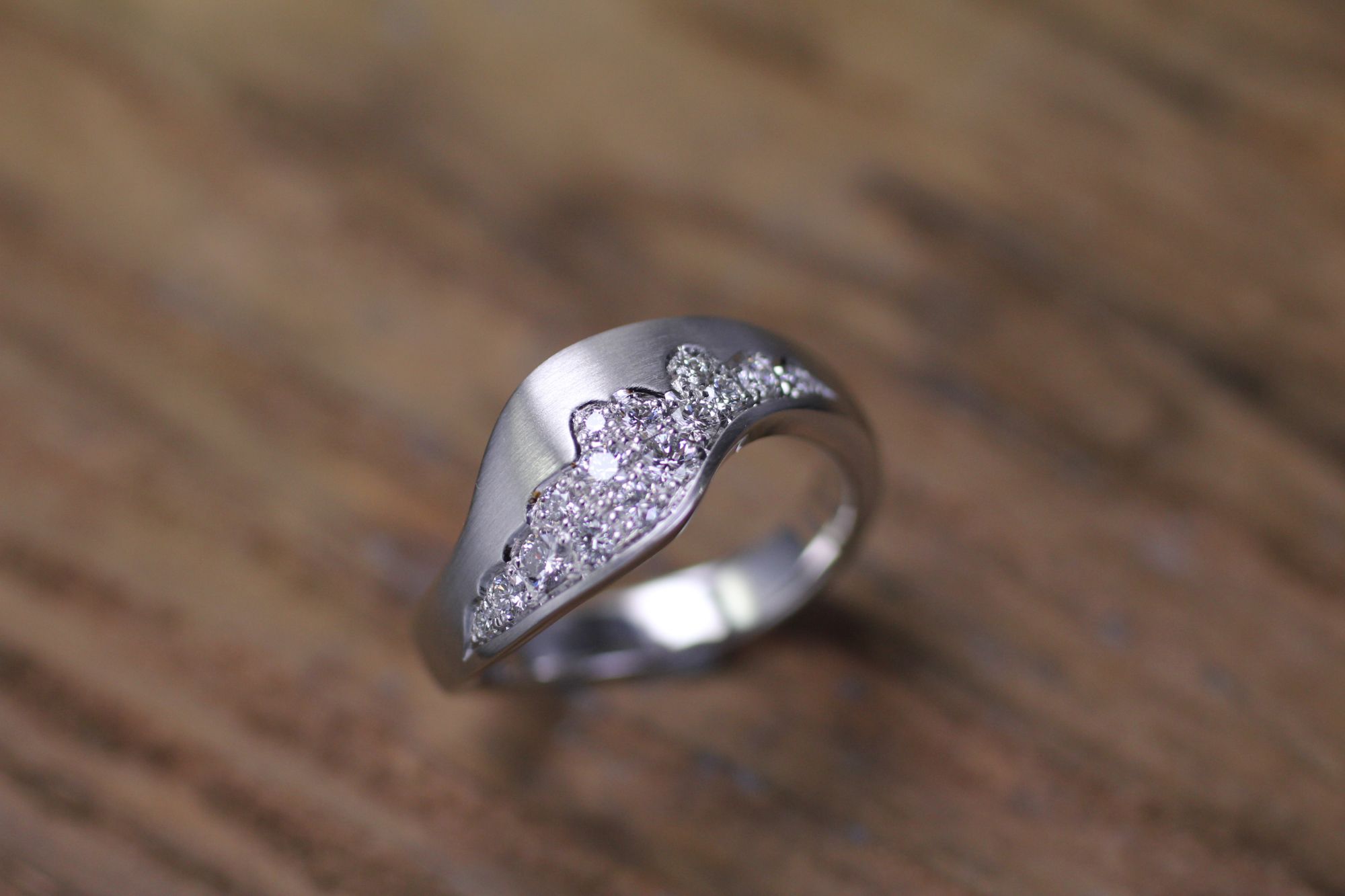 Damenring mit starkem Schwung, Teil ausgefasst mit Brillanten.