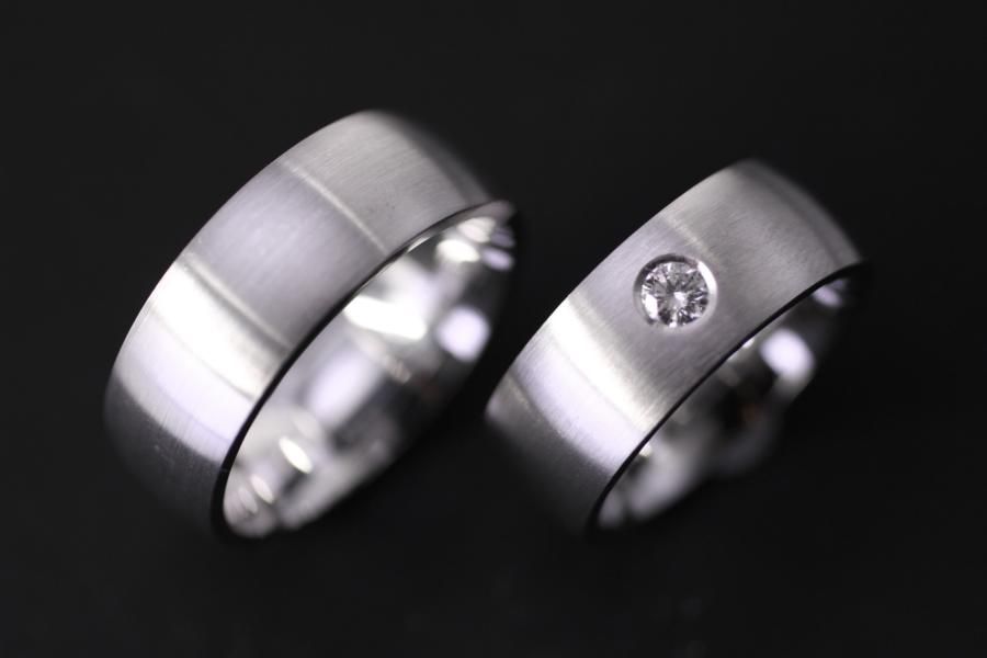 Klassische Trauringe aus Weissgold. Gewölbter Grundkörper von einer angenehmen breite. Oben längsmatt oder eismatt, oder nach ihren Wünschen gestalltet. Der Damenring ist bei unserem Modell zusätzlich mit einem Diamanten geschmückt. Weitere Variationen dieser Trauringe sind nach Absprache möglich. Fügen Sie die Ringe auf die Merkliste und vergleichen Sie sie mit den anderen Schmuckstücken.