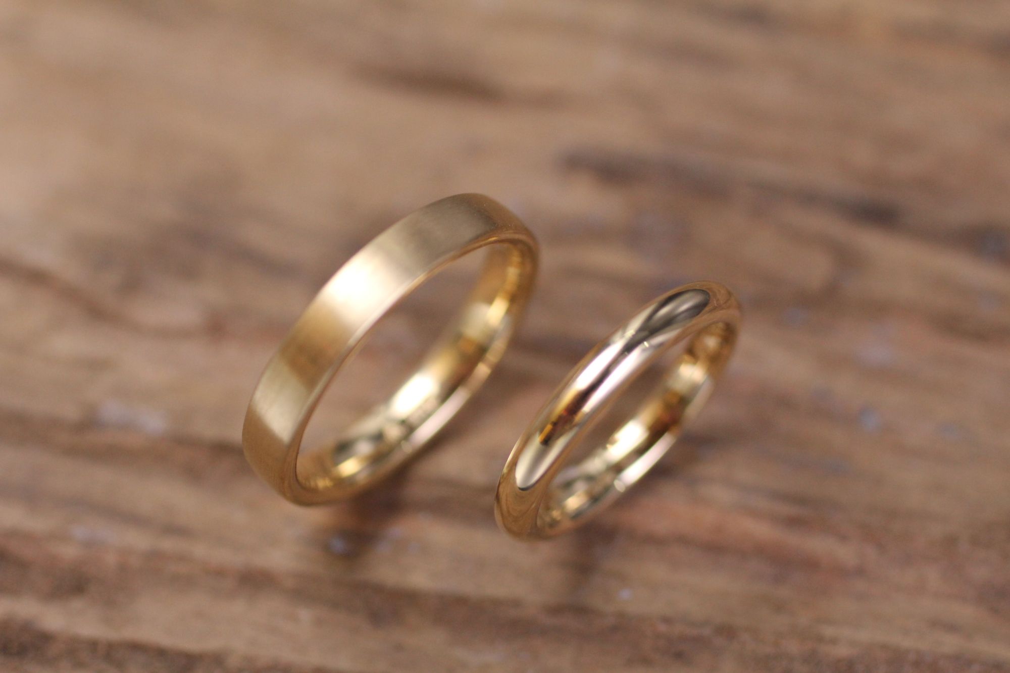 Eheringe in Gelbgold, flach und rund, matt und poliert. Kundenauftrag