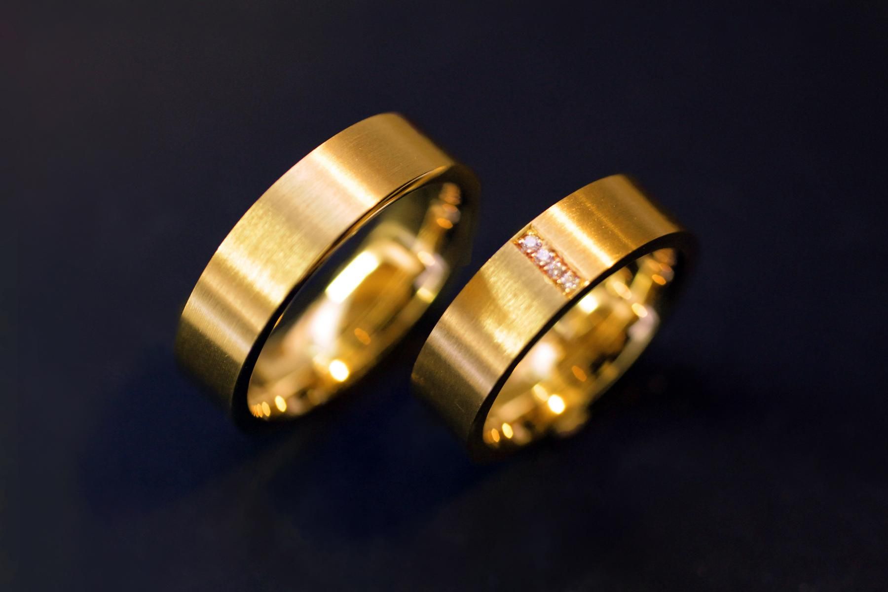 Klassische Trauringe aus Gelbgold mit flacher Oberfläche. Die Ringe sind von einer mittleren Breite und massiv gearbeitet. Die Oberfläche ist bei unserem Modell längsmattiert, die Seiten und innen sind glänzend. Der Damenring wird mit einem eleganten Brillantsegment aus vier Diamanten zusätzlich verziert. Weitere Variationen dieser Trauringe sind nach Absprache möglich. Fügen Sie die Ringe auf die Merkliste und vergleichen Sie sie mit den anderen Schmuckstücken.