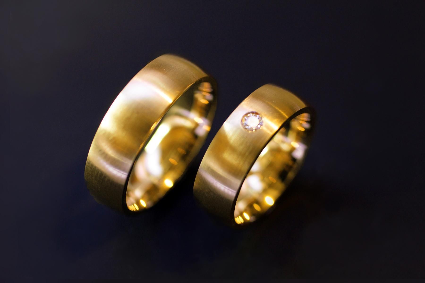 Klassische Trauringe aus Gelbgold. Gewölbter Grundkörper von einer mittleren breite und hohem Tragekomfort. Innen poliert, oben längsmattiert. Der Damenring ist bei unserem Modell zusätzlich mit einem Diamanten geschmückt. Weitere Variationen dieser Trauringe sind nach Absprache möglich. Fügen Sie die Ringe auf die Merkliste und vergleichen Sie sie mit den anderen Schmuckstücken.