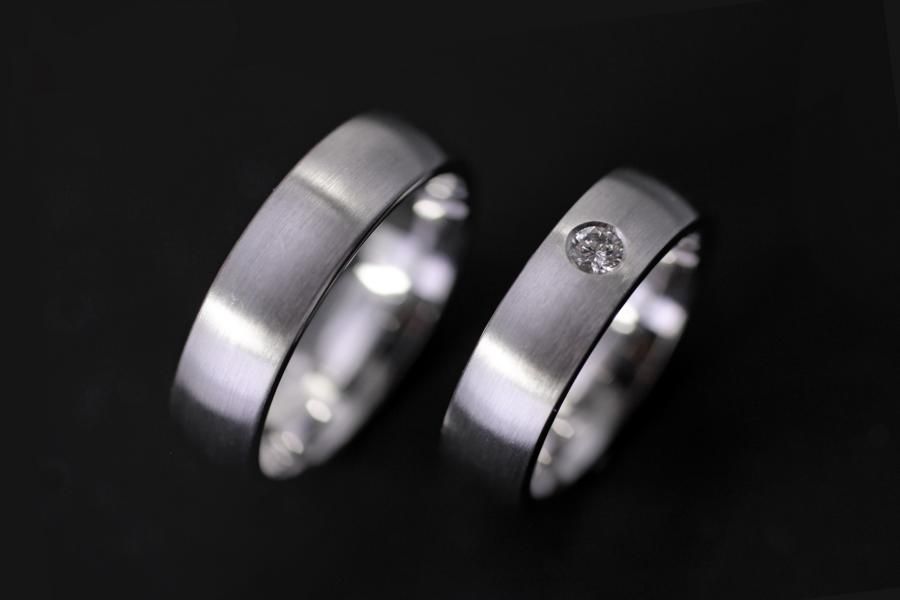 Trauringe in Weissgold mit einem bequemen ovalen Querschnitt. Unser Model wurde innen poliert und aussen längsmattiert. Die Ringe sind von einer angenehmen mittleren Breite und massiv gearbeitet. Den Damenring haben wir mit einem Diamanten etwas mehr Glanz verliehen. Diese zeitlosen Klassiker machen nicht nur alles mit sie sind auch wandelbar wie das Leben selber. Weitere Variationen dieser Trauringe sind nach Absprache möglich. Fügen Sie die Ringe auf die Merkliste und vergleichen Sie sie mit den anderen Schmuckstücken