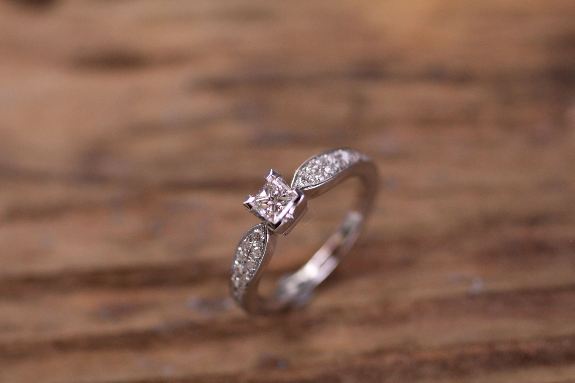 Weissgold Verlobungsring, Princess Diamant und seitlichen Brillanten.